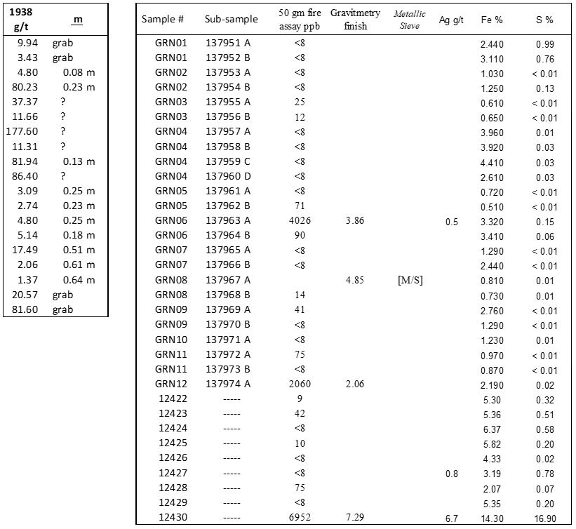 Ten of the samples were split into two to four sub-samples before delivery to the lab. Two of those samples yielded high gold values (3.86 g/t Au and 4.85 g/t Au respectively) from one of the two sub-samples, but only very low values (0.090 g/t Au and 0.014 g/t Au) from the second sub-sample, indicative of a nuggety (coarse) gold occurrence at Grenadier.