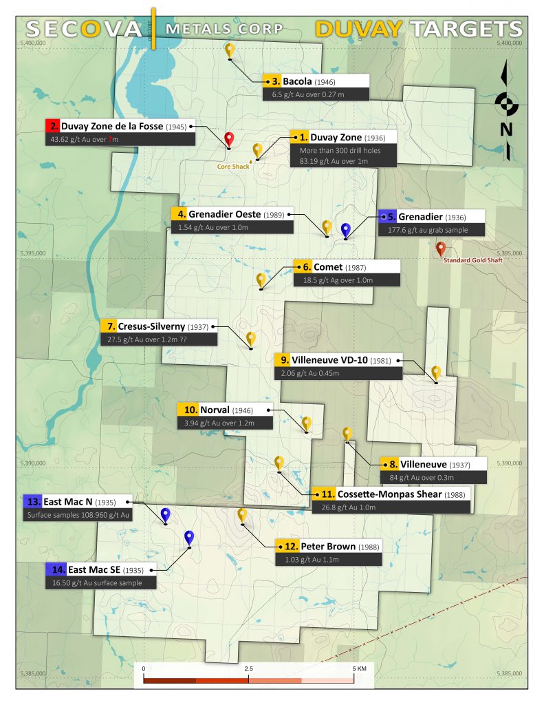 VANCOUVER, BRITISH COLUMBIA – March 16, 2018 – Secova Metals Corp. (“Secova” or the “Company”) (TSXV: SEK FSE: N4UN OTC: SEKZF) and Tres-Or Resources Ltd. (“Tres-Or”; TSX-V: TRS, OTCPK: TRSFF) are pleased to report results from surface grab sample gold assays taken at the Grenadier Gold showing and the final drill results from the Lake Obalski exploration targets from the Duvay-Chenier Gold Project (the “Property”), located 15 km northeast of Amos, Quebec.