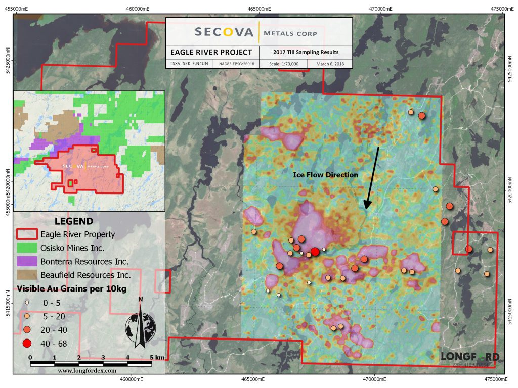 “Longford did a great job in both identifying the anomalies and potential location of down ice results. The exploration program returned over a 96% success rate of finding gold particles. Not only that but some of the results are exciting when thinking about the next exploration steps. Although only a few of the results were pristine, there is a very high likelihood that all particles were sourced within Secova’s claim boundaries. These results compare very favourably to the Osisko till sampling study conducted on their Windfall property in 2015,” stated Brad Kitchen, C.E.O. of Secova Metals. “The Company will develop a further exploration plan to better delineate where the gold particles were sourced potentially leading to a drill program in the near future.”