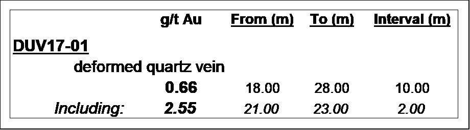 Table 1: Gold bearing interval from the first forty samples sent to the lab. Note that the received sample results extend from 3.0 to 46.5 m depth in drill hole DUV17-01. The remaining core from DUV17-01 extending to the end of hole at 201 m is at the lab.